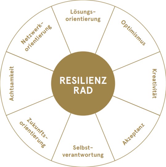 Die im Resilienzrad aufgeführten 8 Bereiche sind massgebend für die mentale Gesundheit: Optimismus, Kreativität, Akzeptanz, Selbstverantwortung, Zukunftsorientierung, Achtsamkeit, Netzwerkorientierung, Lösungsorientierung. Dahinter stehen Haltungen, mit welcher wir eine Situation und uns selber betrachten und bewerten.